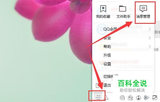 首先,我们在电脑上登陆QQ,进入QQ界面。然后点击界面左下角红色方框里面的符号,在弹出来的选项中点击右上角的"消息管理"。