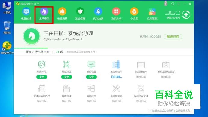 首先打开360卫士,找到“木马查杀”进行全面扫描; 或者用“360杀毒”进行全盘扫描,将“风险项(包括木马,病毒等)”全部处理