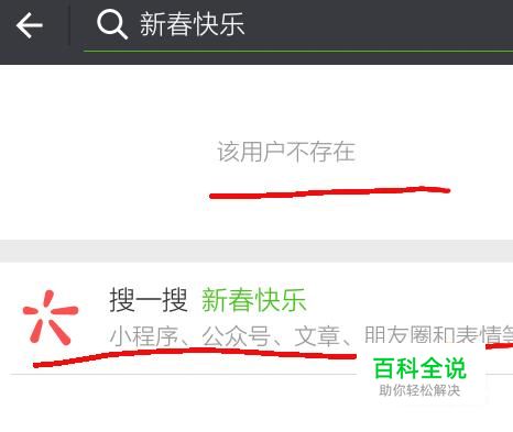 点击进入手机微信,在搜索栏中输入“新春快乐”,显示无用户,点击下方“搜一搜”