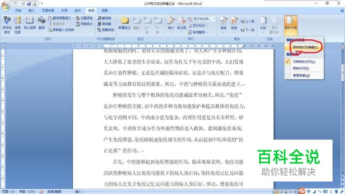 首先打开要用的文档,点击“审阅”中的“保护文档”,再点击“限制格式和编辑”