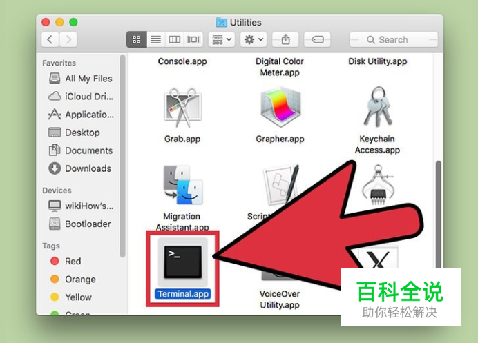启动终端程序。在 应用程序→ 实用程序→ 终端中找到终端程序。你也可以使用右上角的“spotlight”功能来打开终端程序。