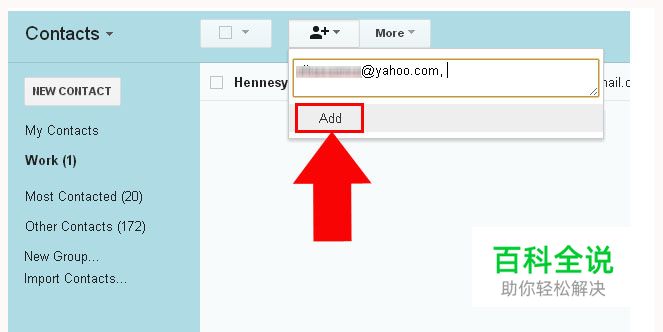 点击“添加联系人”图标(如图)。接着会打开一个窗口,允许你输入联系人,并将它添加到群组中。 例如,通讯录里有一个人叫张三,那么在窗口中输入“张三”,就会弹出他的邮箱地址。点击它。 点击“添加”按钮。