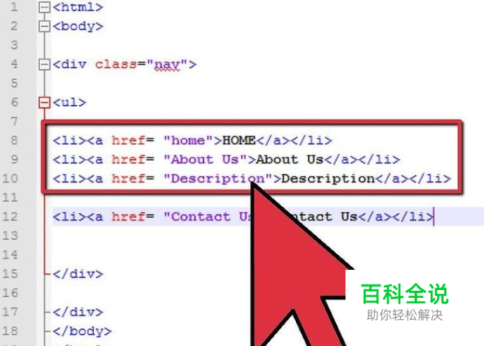 在主菜单区域中添加链接。在本步骤中,在无序列表(ul)每一项上添加链接。