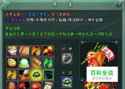 松子分为蓝色、绿色以及紫色,不同的颜色,获得装备的品级也不同,其中蓝松果能够换得极品5星装备还有可能获得神兽金甲神牛,绿松果能够获得7星极品装备,还能与天煞狂狼亲密接触,至于紫色松果,将换得极品10星装备,还能够将玄冥圣虎收入麾下,所以赶紧去刷副本,寻秘宝,戏松鼠吧!