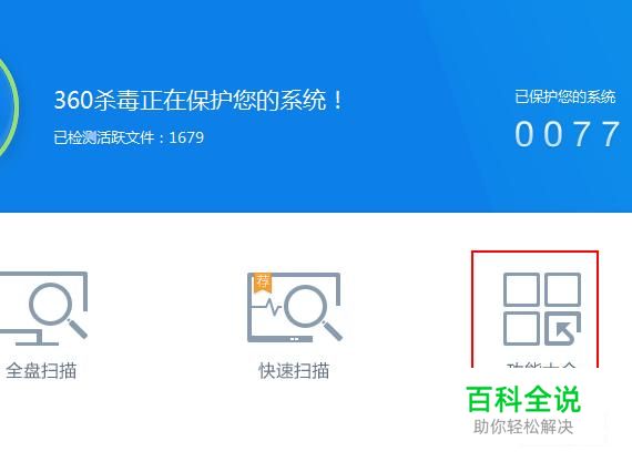 打开360杀毒软件,在其首页界面上点击【功能大全】选项。