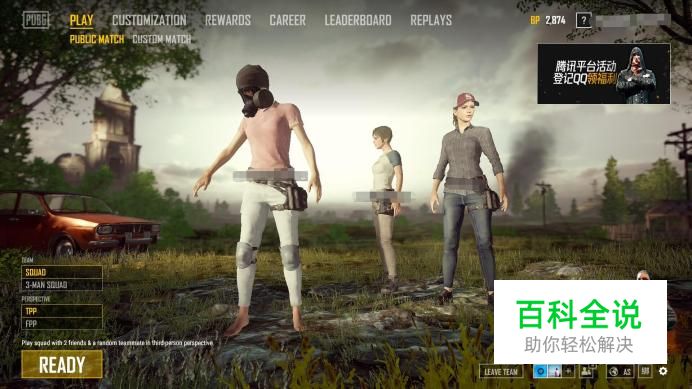 点击左下角team里的3-MAN SQUAD,然后便可以点击READY开始三排了!