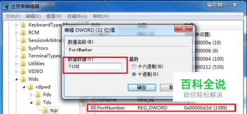 打开注册表编辑器,修改第一处[HKEY_LOCAL_MACHINE\SYSTEM\CurrentControlSet\Control\Terminal Server\Wds\rdpwd\Tds\tcp],看到右边的PortNumber了吗?在十进制状态下改成你想要的端口号吧,比如7126之类的,只要不与其它冲突即可。