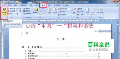 点击菜单栏审阅——拼写与语法、调出拼写和语法按钮窗口。