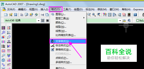 文字样式的设置关系到写入的字形、字高、比例等,要想达到理想的效果,首先要对它进行正确的设置,我们可以从菜单栏【格式】下点击进入文字样式设置对话框。