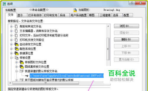 在【选项】对话框下找到“样板设置”,“快速新建默认样板文件名”,双击箭头打开图形模板文件。