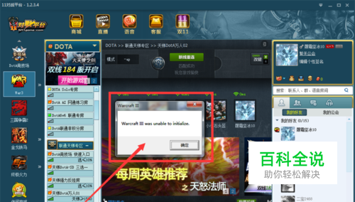 当你在11平台、QQ平台、vs平台及其他玩《魔兽争霸3冰封王座》中的dota游戏时,会出现下面“Warcraft Ⅲ was unable to initialize”这样的错误提示对话框,这句话的意思是:魔兽争霸程序无法初始化。以11平台为例解决方法如下: