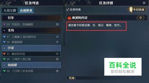 逆水寒最初的约定奇遇任务是在清明上河图桥上接的,谨言童子在我们角色25级的时候随机给的任务。我们点击找到谨言童子接取任务。