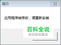 打开软件提示:“应用程序被修改,请重新安装!”,点击“确定“按钮,关闭。