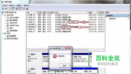 以WIN7系统为例,打开磁盘管理,磁盘状态凡是出现“页面文件”的盘都无法修改盘符,图中C盘、J盘修改盘符都会出现参数错误,那我们怎么解决呢?