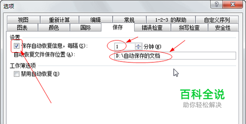 在这里我们把将默认的“保存自动恢复信息,每隔10 分钟”,设置为1 分钟。 将默认的“自动恢复文件保存位置”路径,设置成自己指定的路径, 如D:\自动保存的文档,设置完成后,单击“确定”按钮即可。