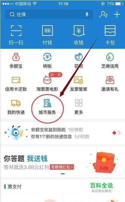 首先,打开手机支付宝,然后点开 城市服务