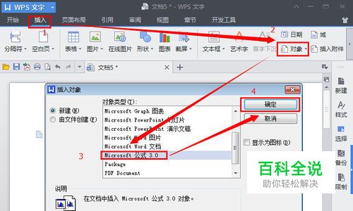 单击进入“插入”选项卡,在“符号”选项组中选择“公式”按钮;如果“公式”为灰色的话可以单击“插入”菜单中的“对象”命令,从弹出的“插入对象”对话框中选择“Microsoft公式3.0”,单击“确定”按钮,出现“公式对话框”。