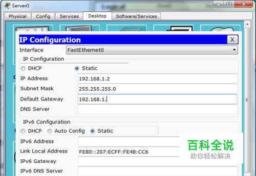 配置Server-PT服务器 IP:192.168.1.2 子网掩码:255.255.255.0 网关:192.168.1.1