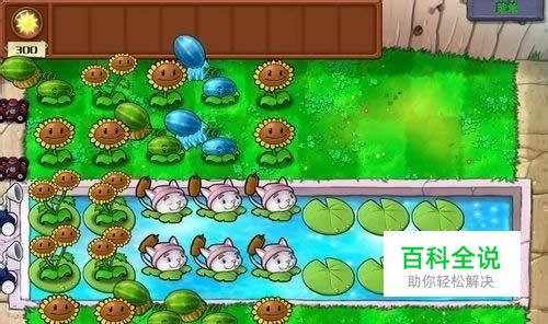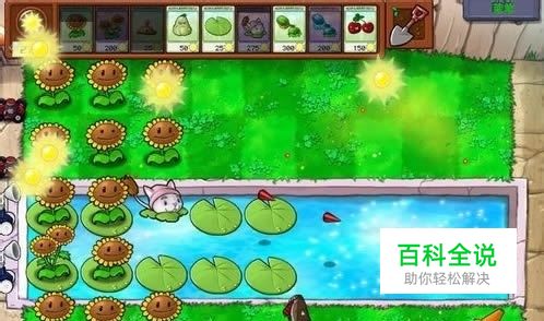 接着继续在一至五列(或一至六列,也可以随便种,个人喜好呗)种向日葵。多了以后就在一二列种上双胞向日葵(最好先种在睡莲上)。还是要在每行放土豆、窝瓜,保证向日葵的健康安全哈:)