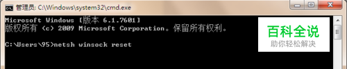 在cmd中输入 “netsh winsock reset” 回车(引号里的英文意思是重置winsock)