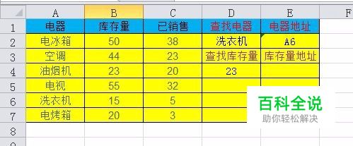 如果我们要查找别的内容,比如查找电冰箱,则我们需要输入电冰箱,然后查找。那么有没有这么一个功能:不需要输入,直接在单元格中选取需要查找的数据,然后另一个单元格自动显示出此数据所在地址呢?下面介绍ADDRESS函数的运用。