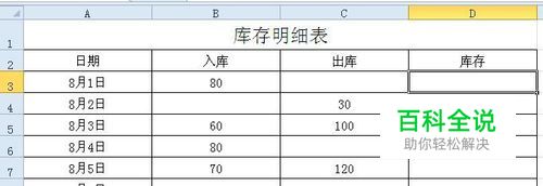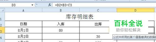 然后输入相关记录,库存数由上天(次)库存加上当天入库数减去出库数得到,这个数据用不着手动计算,可以用公式由软件直接得出结果,如图,在D3输入公式:=SUM(D2,B3)-C3,向下填充即得到相应的库存数量。一定要注意,由于D2是列标题,不能直接用相加的方法,而要用SUM函数来求和,因为直接相加,文本字符不能参与运算,会得出错误值。