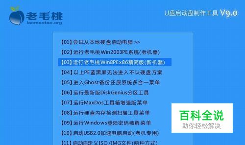 将制作好的老毛桃v9.0启动u盘插入电脑usb插口,开启电脑,待出现开机画面后按快捷键进入到老毛桃主菜单页面,将光标移至“【03】运行老毛桃Win8PEx86精简版(新机器)”,回车确认