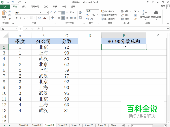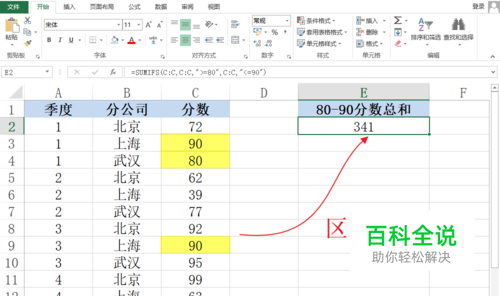 输入区间求和的函数公式。 在E2单元格内输入区间求和的函数公式“=SUMIFS(C:C,C:C,">=80",C:C,"<=90")”。