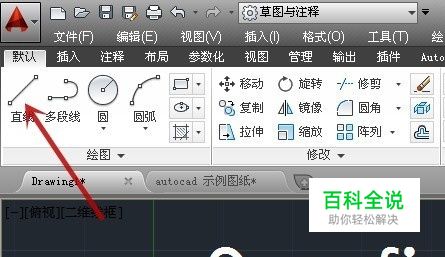 先点顶端工具栏中的“直线”命令(图中红色箭头所指) 也可以在键盘上输入“L”+空格 这个快捷命令进入画线命令