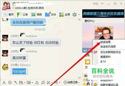 右键点击该人昵称,选择发送消息