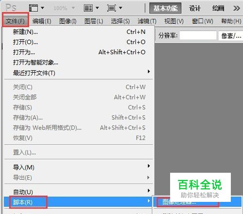 打开PS,点击“文件”---“脚本”---“图像处理器”