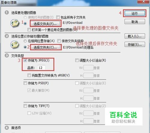 在图像处理器中, 1.选择要处理的图像文件夹 2.选择处理后保存的文件夹 3.选择文件类型:JPG,品质根据需要设置,一般12为最佳。 4.点击“运行”按钮,即完成了,JPG的转换。