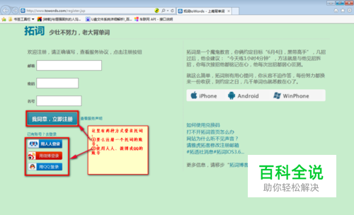 可以有两种方式登录拓词:①在拓词官网上注册一个托词账号,使用该账号登录拓词。②使用人人、微博和QQ的第三方应用账号登录拓词。笔者建议使用第二种方式,因为用已有的人人、微博和QQ账号比较方面,避免账号太多难于管理。