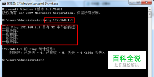 在弹出的命令提示框中输入: ping 192.168.1.1 若电脑和路由器是不连通的,则会返回如下信息,如下图: