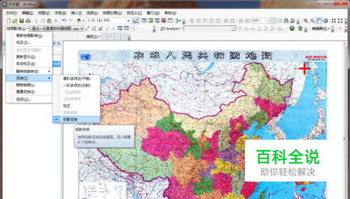 查看地图的地理坐标系和投影类型。在本例中,放大地图到左下角,可以发现投影的类型已经给出。查阅资料可知该图地理坐标系应为西安80坐标系。其它地图可自行查找相关信息。