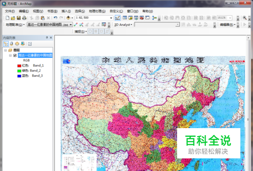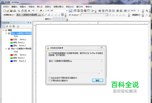 以一幅下载的纸质版中国地图为例。在ArcGIS中打开该地图。可以看到缺乏空间参考信息的提示,点击确定加载地图。