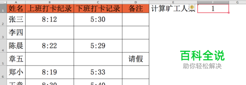 在F1单元格中输入公式“=SUM(ISBLANK(B1:B8)*1)-COUNTIF(D1:D8;"请假")“,首先使用ISBLANK函数返回上班打卡记录为空的单元格的逻辑值,然后使用SUM函数进行汇总;使用COUNTIF函数统计请假的人数;两值相减。