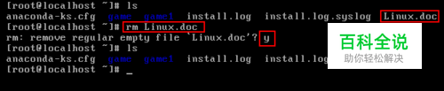 命令可以删除当前目录下的文件,如果不加任何参数,系统会自动提示是否删除,如果确定删除输入y即可完成。需要注意的是删除操作需要操作用户对该文件具有写权限,具体的权限知识后续经验会详细讲述。