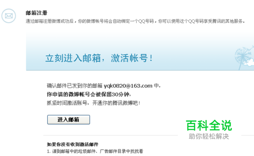 接着会提示进入注册的邮箱,激活账号,注意要在30分钟之内完成,否则会失效的。如果忘记了邮箱密码,需要及时找回。点击“进入邮箱”