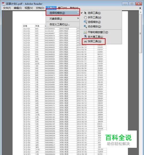 首先打开我们需要转换格式的PDF文件,单击工具,在选择和缩放的下拉选项中,找到快照工具,单击快照工具。