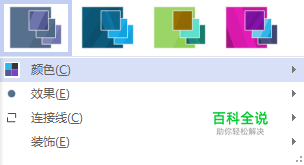 除了当前的颜色,我们还可以到主题右侧的“变体”栏更详细的设置。打开变体栏的下拉三角,出现了颜色、效果、连接线、装饰四个选项,现在对这个变体选项你有没有很眼熟呢?没错,在我们为ppt设计主题的时候,也是运用了变体里的颜色、效果等内容,运用到Visio里面也是一样的操作。