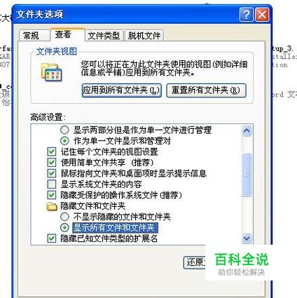 在弹出的文件夹选项对话框里,点击查看栏,在高级设置框里,在隐藏文件和文件夹里,选择“显示所有文件和文件夹”。 点确定