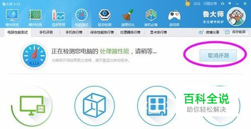 在鲁大师跑分的过程中,我们可以随时取消跑分。点击途中标记的内容即可。