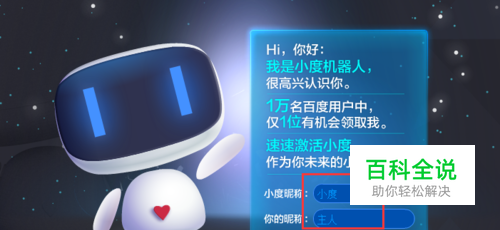 小度机器人领养成功以后, 你可以根据你自己的喜好对小度机器人的昵称和你自己的昵称进行修改,然后点击激活就可以。 如果后期在使用小度机器人的时候你想更改你的昵称,也是可以更改的,但是 一个月只能修改一次昵称。
