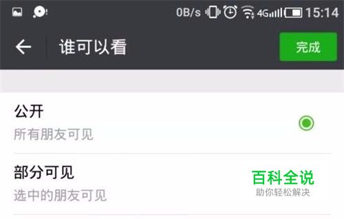 点击“谁可以看”进入权限设置,默认是公开的,剩下两个设置分别是“部分可见”和“不给谁看”,如图所示: