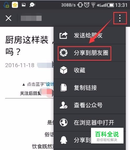 打开一篇文章,然后点击右上角的按钮,在弹出的菜单中选择“分享到朋友圈”,如图所示: