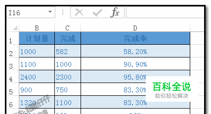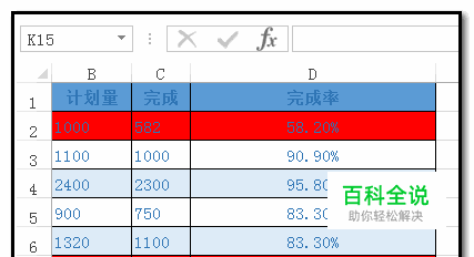 点确定后。面板关闭,我们看到表格已自动为完成率小于<60%的整行填充上红色。