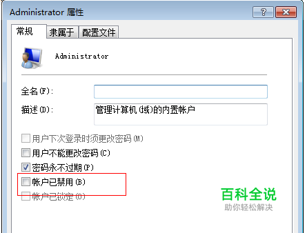 在常规选项卡中取消账户已禁用的勾,并点击确定按钮,如图: