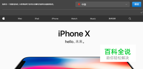 进入苹果官网, 在最顶端选择【中国】后,点击右侧的【继续】。