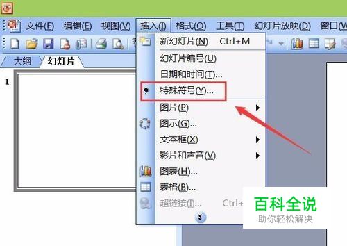 点击插入选项,在其子级菜单里找到特殊符号选项,如图所示: